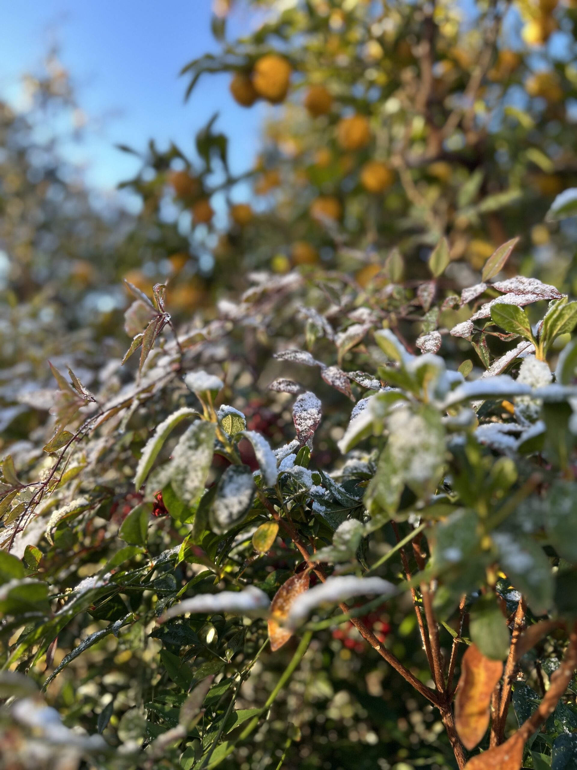 冬の空気と、雪をのせた葉。